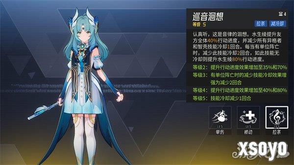 终结技是水生绫的核心技能,主动使用时拉条全体并减少己方所有异格者技能与智壳冷却一回合。当敌方单位阵亡时,减少此技能2回合冷却,如果无法减少,则拉条自身80%
