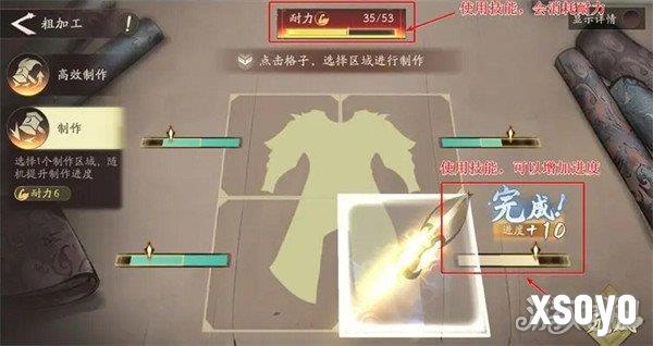 而锻造的难点一般就是火候控制,也就是第三步温度变化那个环节,需要大家观察进度条上的绿色、红色刻度。如图4的指针停在绿色区域时点击淬火,可额外增加5%橙装概率,超过进度条变红直接损坏,而且进入红色区域,即使使用固灵石锁定词条,装备基础属性也会降低8%。将温度控制在65到75中间,淬火成功率是最高的,配合下图也就是第二步选择上面的高效制作,能提升传说装备产出率,而且“指针停稳后再点击”是官方提示,大家别忽视,手速快反而容易出瑕疵装。
