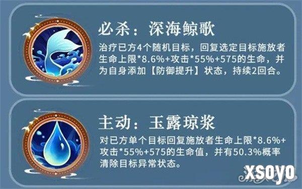 小乔在三国志异闻录中的定位非常明确,属于团队中的奶妈角色,主要职责是维持队友的生命值状态,提升整体生存能力。她的必杀技名为深海鲸戈,能够为己方随机四名队友恢复生命值,恢复量基于小乔自身生命上限的8.6%、攻击力的55%以及固定575点数值叠加而成,综合治疗量相当可观。释放技能后,小乔自身还会获得持续两个回合的防御提升,增强了她在战场上的存活能力。