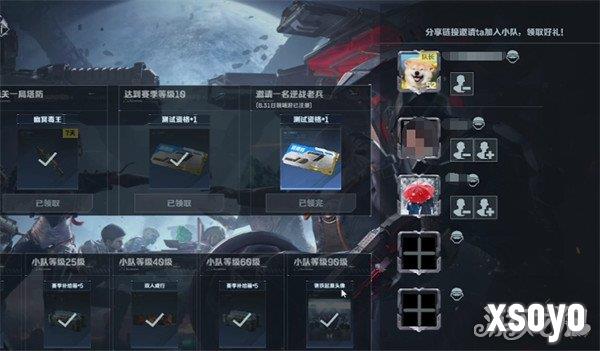 当然在特殊老友的招募活动当中,玩家也可以在招募面板内,邀请并未注册游戏的玩家,随后和他一同组队,当小队等级升级到二十五级、四十级、六十级、九十级时,分别能够领取到游戏内的资源奖励,最高级时,即可获取皮肤奖励。