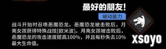 月亮女孩与恶魔恐龙的攻击速度达到标准单位的100%,拥有高频率的普通攻击节奏,配合范围大招与眩晕控制,在近身缠斗中表现出色。她对召唤物的伤害加成显著,但需要操作者具备一定的技能衔接与战场判断能力。推荐将其编入召唤体系队伍,若阵容无法凑齐召唤流,她依然能作为主力输出独立发挥作用。