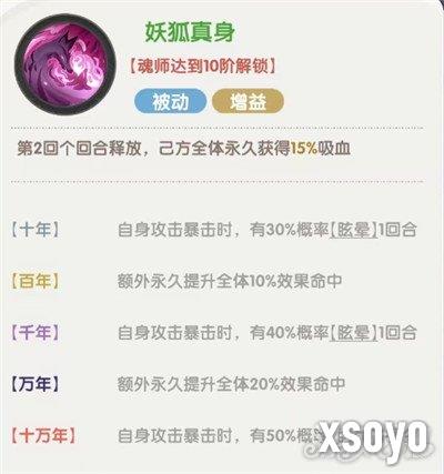 最后一个妖狐真身,第二回合释放,己方全体永久获得吸血加成,在自身攻击暴击时有几率眩晕,还有额外提升全体效果命中属性等。所以作为控制系魂师,胡列娜是非常称职的一个,她不仅可以有效的限制对方,自身在输出方面也非常出色,还可对整个队伍都有伤害方面的加成。阵容搭配小编推荐大家走反击流路线,选择古榕、尘心、胡列娜、邪月和宁荣荣。古榕是很好的前排肉盾,尘心作为强攻系魂师输出很高,尘心和邪月一起配合起来,在胡列娜的控制和增伤辅助之下输出非常暴力。