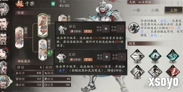 于禁在游戏当中的定位是一个远程骑兵,其三阶段的“奋战“效果,可以无视目标75%的防御,同时在合击技能触发时,自身对敌方目标会再次造成一次,基于自身物理攻击倍率50%的连击效果,协助队友的同时,于禁也可以触发奋战状态。