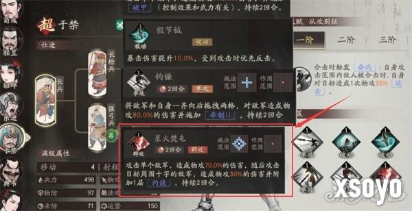 于禁大招效果“星火焚屯”,冷却时间两个回合,属于群攻技,可以攻击单个的敌方目标,同时造成物理攻击70%的伤害,随后伤害会扩散,对周围十字目标的所有敌方军队,造成基于自身物理攻击30%的伤害。