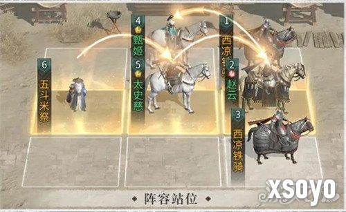 凭借技能【挽弓贯阵】对一整排敌人造成伤害,配合赵云的反击进一步威胁敌方后排。此外,【挽弓贯阵】达到2级后还可通过【避实】效果提升全体友军的闪避率。