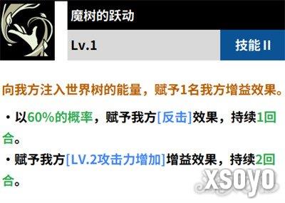 魔树的跃动这个技能是一个带有着辅助效果的技能,该技能可以直接给我方的世界树注入能量,当我方世界树被注入能量以后,我方将会有1名队友被附加上2种增益效果,分别是由60%的可能性赋予上反击的效果和2级的攻击力增加效果,反击效果能持续1回合,没攻击力增效效果能持续2回合。