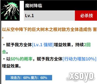 必杀技能魔术降临是一个攻击力和魔力均为60%的技能,该技能使用后,空中将会出现巨大的树木之根,树木之根在降落到地面后会自动攻击所有的敌人,同时还能给我方所有队员附加上1级的强韧增益效果,效果能持续2个回合的战斗,有60%的几率给我方全部队友附加上行动力增加10%的增益效果。