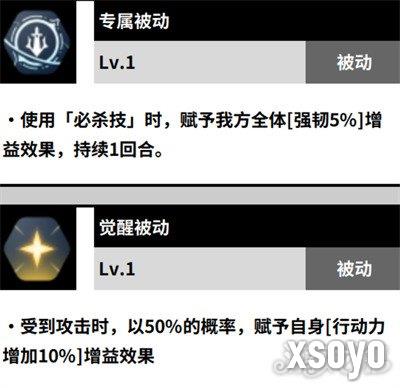 专属被动技能是在威廉使用必杀技的时候才会被触发,技能可以给我方全部队友附加上5%的强韧增益效果,状态持续1回合,觉醒被动技能1级的时候,威廉在受到攻击时,会有50%的概率给自身附加上行动力增加10%的增益,觉醒被动升级到2级后,给自己附加行动力增效10%效果的可能性就变成了100%。