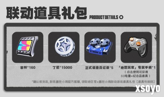 联动道具礼包包括菲林*100、丁尼*15000、正式调查员记录*5和「绝世玩家」专属手柄等联动道具。