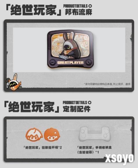 另外还有精美的「绝世玩家」邦布流麻和「绝世玩家」定制配件,这些配件包括摇杆硅胶帽和手柄收纳盒(含拔键器)。