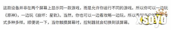 更有趣的是,这并非单纯的“双屏显示同一内容”,而是可以同时运行不同的游戏。比如你能一边玩《原神》,一边开《崩坏:星穹铁道》。甚至还能一边刷攻略一边打游戏。触摸哪块屏幕,手柄就会切换至对应界面,操作直观。