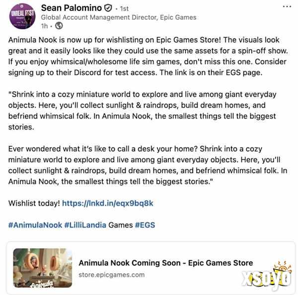 不仅如此,《粒粒的小人国》在海外也收获颇丰。登顶Steam全球免费新游趋势榜,并连续7日霸榜;获得IGN, PlayStation, Epic Games等全球头部媒体、平台的报道和推荐。全球KOL也在游戏pv发布后踊跃响应,有近340名全球KOL(包括3名超百万粉级)主动报名,希望参与内容创作。Epic商店的负责人Sean Palomino更是直接用Linkedin的个人账号进行宣传,称这是一款生活模拟类不容错过的游戏!这一系列反响都说明了业内对产品的期待以及认可,产品具备极高的传播价值。