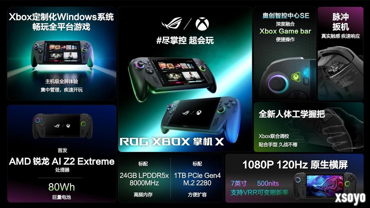 尽掌控,超会玩!首款纯血XBOX掌机,ROG XBOX掌机X于北京时间10月16日15:00正式发布,并于当天晚21:00正式开售,首发价6499元。ROG此次联合微软XBOX团队,实现多点定制,带来Xbox全屏体验、Xbox定制化系统、全新人体工学握把等多项创新设计,实现纯血进化。同时首发搭载AMD锐龙AI Z2 Extreme处理器、配备7英寸1080P 120Hz原生横屏、内置80Wh电池,内外全面升级,赋予玩家全新掌机体验。
