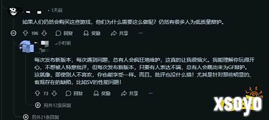 另一部分玩家表示:宝可梦的质量早就这样了,除非换一个愿意花费精力打磨的团队。宝可梦粉丝不喜欢接受批评,做的再差也会有人买。
