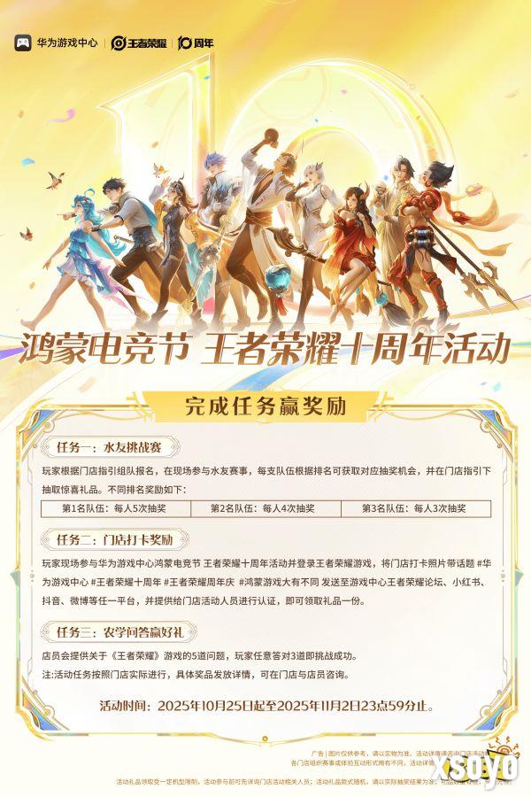10月25日-11月2日,华为游戏中心与竞技手游《王者荣耀》再度携手,在全国范围内上千家华为智能生活馆及授权体验店启动鸿蒙电竞节《王者荣耀》十周年活动,为召唤师们带来“大有不同”的游戏盛宴。玩家不仅可亲临线下门店体验王者周年庆氛围、体验鸿蒙特性带来的非凡体验,还能在华为游戏中心领取王者为华为用户定制的「璀璨星河头像框」等专属好礼,诚邀各位玩家畅意共赴这场值得铭记的游戏之旅!