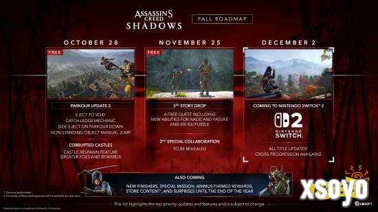 《刺客信条:影》已于2025年10月24日由育碧正式官宣,确定将于12月2日登陆任天堂Switch 2平台,售价59.99美元(约合人民币425.7元)。该版本将支持全菜单触屏操作(包括地图、商城及藏身处管理)并实现跨平台进度同步;同期公布的秋季更新路线图显示,游戏将于10月28日推出“进阶跑酷”模式,移除移动轨道限制,大幅提升动作自由度。Switch 2版首批发售的实机截图因其精细画质与特效处理获广泛好评 。