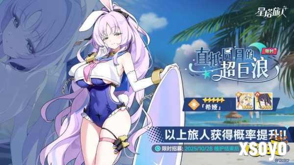 活动期间,旅人招募卡池【直抵圆月的超巨浪】于10月28日限时开启,全新5星旅人【希娅】获得限时招募概率提升。希娅热爱与大海相关的一切,尤其喜欢冲浪,享受海洋的辽阔与自由。身为绒绒族的兔子少女,她还拥有异常敏锐的嗅觉,能通过气味感知他人情绪与性格,而面对重要的人,她会用肢体接触表达好感。在战斗中,希娅作为先锋定位的光属性角色,通过操纵神器浮游炮“雪兔&夜兔”,展现迷人的战斗风姿。