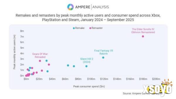 该项研究取样覆盖2024年1月至2025年9月期间发行的42款作品(含15款重制版、27款复刻版),数据显示消费者对单款重制版游戏的投入平均达到复刻版的2.2倍。值得注意的是,《上古卷轴4:湮没》复刻版成为复刻阵营中的突出案例,其在PlayStation、Xbox和Steam平台的玩家消费峰值约1.8亿美元,月活跃用户数最高达700万。