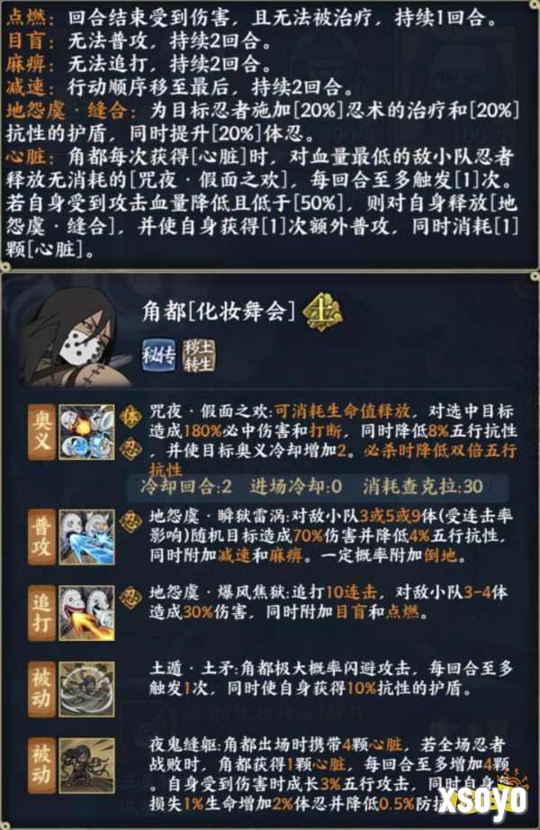 被动Ⅱ:夜鬼缝躯:角都出场时携带4颗心脏,若全场忍者战败时,角都获得1颗心脏,每回合至多增加4颗。自身受到伤害时成长3%五行攻击,同时自身每损失1%生命增加2%体忍并降低0.5%防抗。