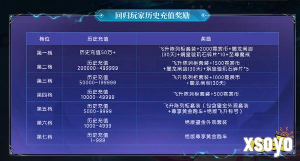 本次新服特别为回归玩家定制专属权益,账号满足“≥30天未登录”条件即可认定为“回归玩家”,可领取回流专属奖励(活跃玩家无法领取)。回归玩家历史充值奖励共设7个档位,根据玩家历史充值金额分级发放,充值额度越高福利越丰厚,涵盖飞升陈列柜套装、霓裳币、娲皇璇玑石碎片、绝版鎏金外观套装、绝版尊享黄金跑车等珍稀道具,帮助回归玩家快速衔接战力,重拾巅峰游戏体验。
