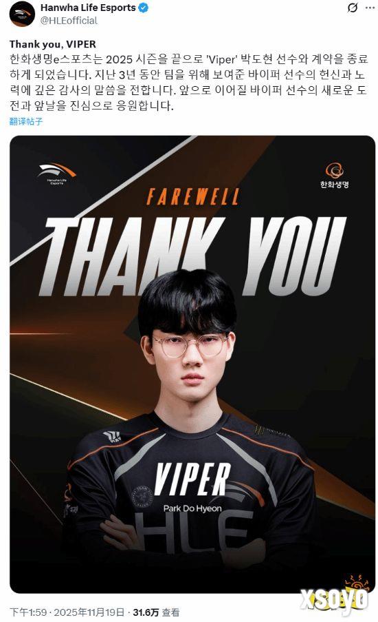 “Thank you, VIPER。Hanwha Life电子竞技俱乐部与‘Viper’朴到贤选手的合约将于2025赛季结束后正式到期。对于过去三年来,Viper选手为战队所展现的奉献与努力,我们深表感谢。我们由衷祝愿Viper选手在未来全新的挑战与前行道路上一切顺利。”