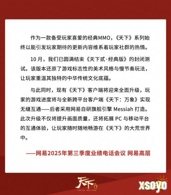 无论是目前正在持续进行共创的《天下贰·经典版》、还是正在进行最后阶段适配开发工作的《天下:万象》,都得到了网易高层的认可。