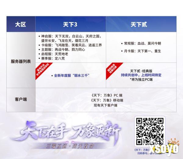 回归初心,重塑经典的《天下贰·经典版》、带你重回激情岁月的特色赛季制探索和“年度服”弱水三千、三端互通逆天改命的《天下:万象》……我们也希望可以继续在更符合大家期盼的路上奋战,以不断焕新的面貌,陪伴各位少侠!