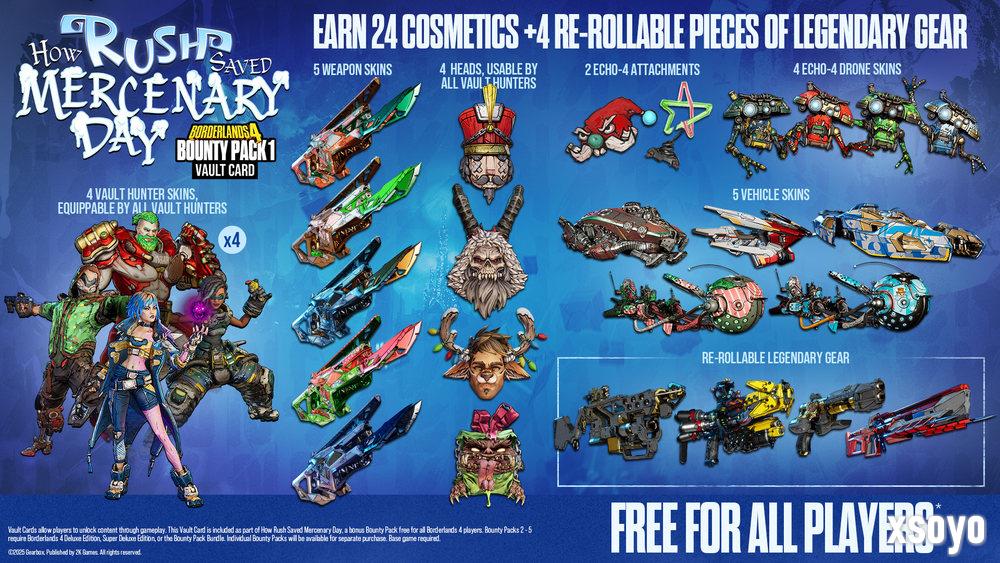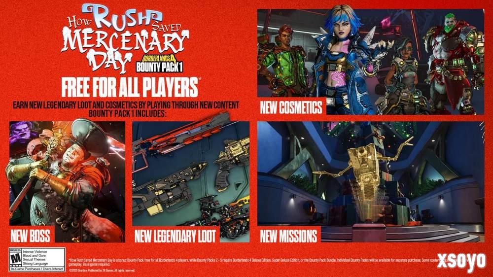 除了将首个赏金包免费提供外,2K 和 Gearbox 还将额外增加一个全新的、第五个赏金包,这意味着玩家可以在未来一年里期待凯洛斯星上更多的狂欢。已购买赏金包捆绑包的玩家,将可免费获取新增的第五个赏金包。豪华版、超级豪华版或赏金包捆绑包的所有者仍将照常获得四个付费悬赏包(悬赏包2、3、4和5),而现在所有玩家均可免费获得首个赏金包。* 关于更多未来赏金包发布时间与内容的详情,将在后续公布。
