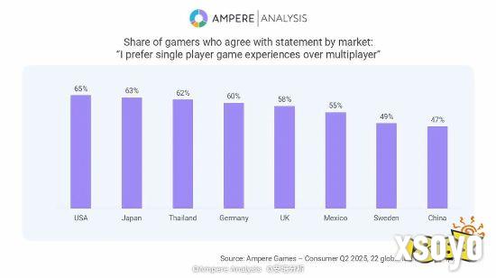 数据显示,美国是单人游戏爱好者比例最高的国家,高达65%的玩家更偏好单人体验。日本(63%)、泰国(62%)和德国(60%)紧随其后。相比之下,英国为58%。