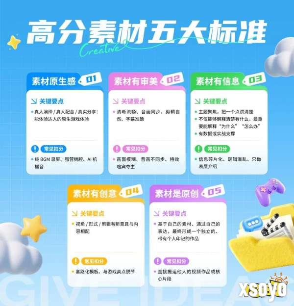 基于“提升投放效率、优化用户体验”的目标,平台提炼出高分素材的5大标准。这些标准并非抽象概念,而是从用户偏好与投放数据中总结的、简单直接的创作方向,帮助快速锚定优质内容的关键维度。