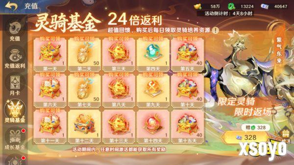 可领取超多灵骑养成资源的「灵骑基金」现已登场!快用它来帮助各位守护使大人快速培养心仪的灵骑吧~购买“灵骑基金”后,守护使大人可连续15天每天领取超高价值的稀有资源,其中包括太虚骑装二选一、玄霄神玉、天启灵骑碎片三选一、太虚兽典二选一、资质丹、灵骑技能任选箱以及杨柳甘露。使用天启灵骑碎片三选一后,守护使可以在踏雪寻踪,山岳潜形,紫气东来这三个天启灵骑的碎片中任选1个,再加上其他培养道具,守护使大人可以轻松对灵骑进行养成~