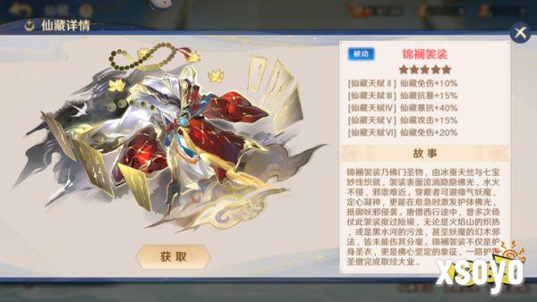 新增红色仙藏锦襕袈裟,为守护使大人带来独特战斗效果。 锦襕袈裟:首次释放仙藏技能后,立即回复一定点数仙藏怒气并使下一个行动的仙藏攻击时增加一定百分比暴击和伤害,若下一个行动的仙藏成功击败神将,则再次回复一定点数仙藏怒气。