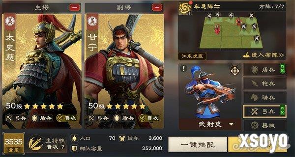 这支弓兵队的质量也特别高,甘宁可给部队提供连击、提高队伍输出频率,太史慈可提供倒戈,通过倒戈可以使队伍边输出边恢复伤兵,队伍能够兼顾持续作战及爆发。如果觉得弓兵容易被盾兵、骑兵双克制,这支队伍也支持转盾兵,这部分建议基于实际情况灵活调整。