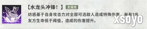 她的支援技“水龙头冲锋”是一个范围性伤害技能,能够对所有敌方目标造成特殊伤害。当友方单位生命值低于阈值时,该技能的伤害将得到额外提升。这种机制使纺惑在队伍整体血量较为危险的情况下,可以迅速打出更高的群体输出,兼具清场与压制能力。