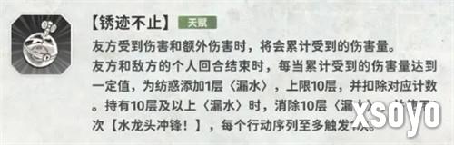 纺惑的天赋“锈迹不止”是其机制的核心所在。队伍中有人受到伤害时,她会积累对应的“漏水”层数,达到上限后自动释放一次“水龙头冲锋”。这一被动技能相当于额外的群体输出循环,使她在战斗中能够持续制造压力,而不仅仅依赖主动释放技能。