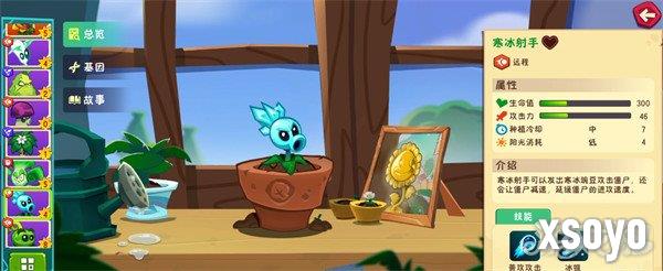 生命值和攻击力都相对还算均衡,是远距离输出植物。普攻向右侧一行发射寒冰豌豆,对距离最近的1个单位造成自身攻击力100%伤害,还会附带5秒的减速效果。小技能“冰锥”,它的下次攻击变为发射一发冰锥,对命中的1X1范围内的敌人造成自身攻击力118%伤害,并对僵尸造成冰冻效果。攻击力充足,同时能给僵尸进行控制,延缓它们的进攻速度。