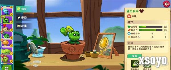 也是远程植物,攻击力超强,基础攻击就达到了110。普攻会对右侧一行距离较近的僵尸投掷西瓜,击中后对3X3范围内全部敌人造成自身攻击力50%伤害。小技能“西瓜爆破”,它的下次攻击会向全场最近的敌方目标投掷出4个西瓜,对技能范围内全体敌方目标造成233%攻击力损伤。能对群体进攻,且攻击力强悍。