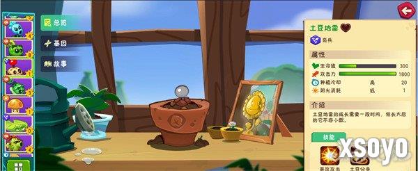 攻击力达到了1800的奇兵。将它种下去之后,需要等待一段时间成长,成型后才会出现在地面,与僵尸接触后会立刻自爆,对1格内全部敌方造成50%伤害。拥有技能“土豆分身”,它的技能使用后会随机在场上生成2个土豆地雷。虽然是一次性的,但是杀伤力十足。
