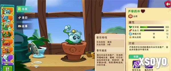 它能投掷剧毒的花朵攻击僵尸,让僵尸受到持续叠加的中毒效果。普攻就是通过花朵攻击僵尸,攻击附带毒碱,一旦击中会受到持续伤害,最高4层,每层附加25的伤害。小技能可以通过投掷毒瓶对3个目标进行攻击,敌人不仅受到100%伤害,还会被叠加一层“毒碱”。