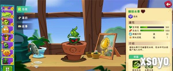 它也不会主动攻击僵尸,一般在水下使用,可以将接触到的第一个僵尸拖入水中然后一起消失,如果不能拖下水,则会对其造成50%伤害。“水草分身”能在自己上下两格各生成1个水草。