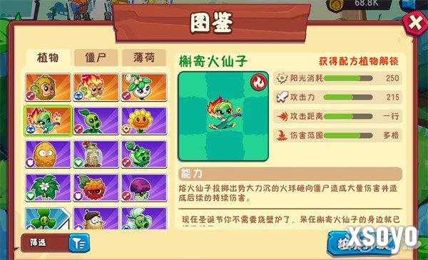 榭寄火仙子能向敌人抛射出一颗陨石,命中了落点处的敌人后,陨石会继续滚动继续对路径上的敌人造成伤害,并在维持一段时间后彻底爆开,再次对范围内的僵尸造成打击,有着非常实用的清兵效果。若人们想获得榭寄火仙子,可用榭寄生和岩浆玉露来完成融合。