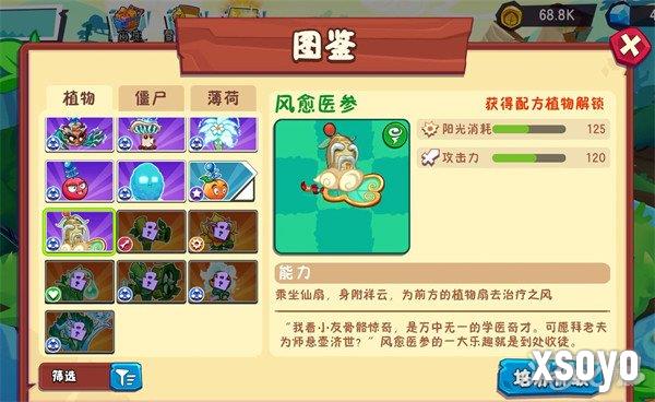 可通过使用人参与与三叶草的组合来融合出风愈医参,它可为其它植物提供不错的治疗效果,即便植物被僵尸啃咬了,在它的治疗下很快就能恢复如初,很适合放在防御类植物后边。只不过风愈医参缺少输出手段,所以在使用适合一定要在它后方放一些攻击植物来将风愈医参给保住。