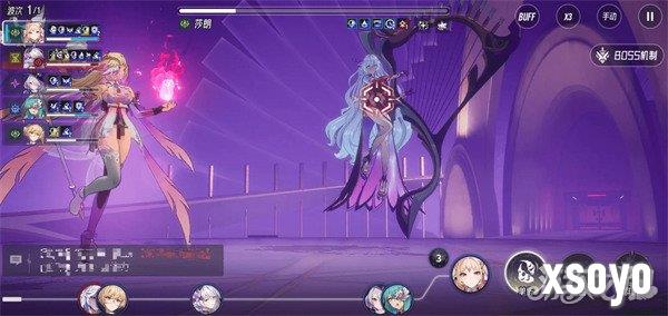 莎朗是我们爬塔中会遇到的难度boss,她总共有3个阶段,第1阶段我们通过酣梦的“睡眠花苞”,以及芙蕾雅的技能二来抵抗住持续伤害,同时去压莎朗的血线,等压到还有一丝血的时候,让凌罗开大附加免疫效果,然后下一位角色平a收掉进入2阶段;在2阶段花骨朵会随机选择两位角色来附加标记,当被标记者行动时,花骨朵若没有处于不可行动状态,会眩晕一位并立刻行动一次;