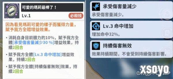 除了提升输出,葛修也很会保护队友。他的必杀技“可爱的玛丽是最棒的!”会消耗自身一部分生命值,但能为全体盟友提供伤害降低和命中增加的增益,还能格挡持续伤害,这意味着队伍中脆皮输出角色在关键回合能够安全输出,不容易被秒杀。配合觉醒被动和专属被动,葛修还能在技能释放或buff被切断时恢复生命,为队伍提供额外续航,让战斗打得更持久。