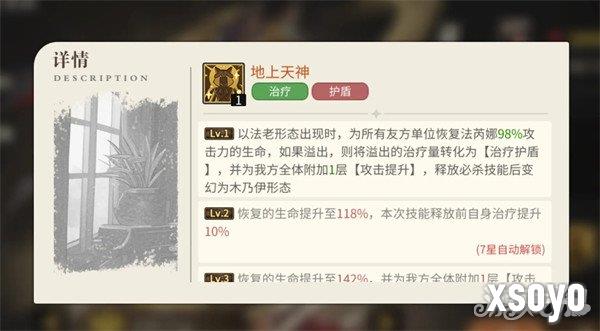 另一技能神之化身可根据法芮娜在队伍中的站位,来切换她以什么样的形态进站作战。位于前中排时,法芮娜会以法老形态登场,为队友提供太阳威光增益,来提升队伍的整体输出。而当法芮娜处于后排时,她会以木乃伊形态登场,对敌方全体施加冥河诅咒,降低全部敌人的输出,且该诅咒无法被驱散。此外,当法芮娜以法老形态出战时,她还通过地上天神技能为队友提供不错的治疗能力,若治疗所加的血量超过目标最大血量上限,本次溢出的治疗量还可被她转换为护盾保护目标,该效果为实时生效。
