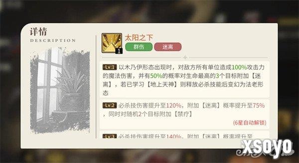 而位于木乃伊形态的法芮娜,则可释放必杀太阳之下对敌方所以目标都造成伤害,且会挑选最多三个目标施加迷离效果,让对方在进行必杀技释放时,有50%变成使用普攻,且敌方的怒气依然会正常消耗,让敌方不光无法使用必杀来攻击本方角色,还会失去怒气,打乱敌方的输出节奏。若是能将法芮娜升到六星,那么在太阳之下等级到达二级时,迷离的触发概率会提高至75%,且还会额外对两个目标释放禁疗效果。此外,一旦木乃伊形态的法芮娜释放了太阳之下,那么在学习了地上天神技能后会立刻切换成法老形态,再次释放大招可切回木乃伊形态。