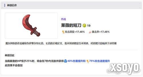 第3个神器为大家推荐叫做莱薇的短刀,这个神器在攻速有一定提升之后,还可以给角色的暴击属性都带来一定的数值加成,在效果上面,大家可以根据目前血量的数值来操作,因为只要是在血量状态低于25%的时候,这个神器就会给大家增添无敌的效果,无敌状态会一共持续几秒时间,在这个无敌状态之内,角色的伤害会有40%的提升,并且在攻速上面达到最高的提升效果会达到79%的数值,这个数值比很多的角色在技能的提升数值上面要高了。