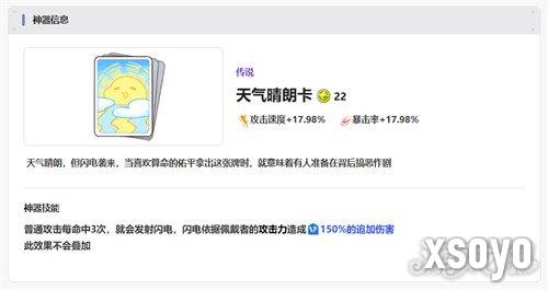 第4个神器叫做天气晴朗卡,带来的攻速以及暴击概率加成比较高,这里大家如果拥有攻击命中3次的效果的话,那么在后面还可以连续发射一个闪电,带来一次最佳攻击的能力。
