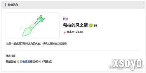第5个神器叫做希拉的风之箭,这个神器更适合一些风属性的角色使用,装备这个神器带来的暴击属性加成是非常不错的,因为这里还有60%的攻速加成效果,所以叠加起来的话,大家走暴击流是非常适合的。
