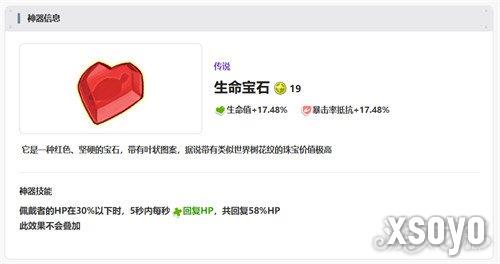 第7件神器为大家推荐就是生命宝石,生命宝石目前带来的生命值提升效果还是比较不错的,并且它本身带有一定的暴击抵抗加成,如果是装备本身属性就不错的话,那么这个角色本身的血量在低于30%的时候,还可以给自己带来一定的恢复能力,不过恢复是只有在神器触发时间之内才可以使用的。